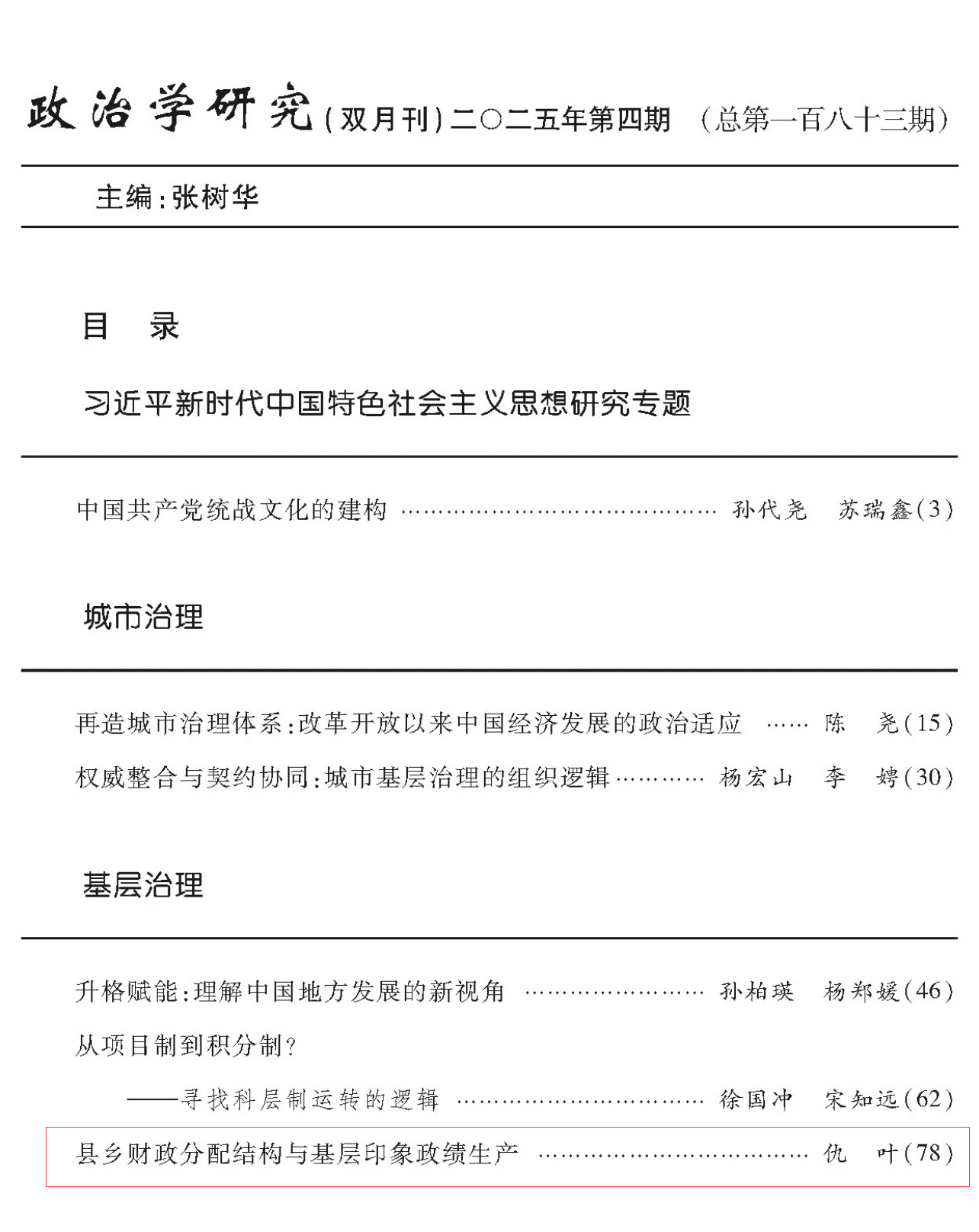 仇叶副教授的学术文章《县乡财政分配结构与基层印象政绩生产》。